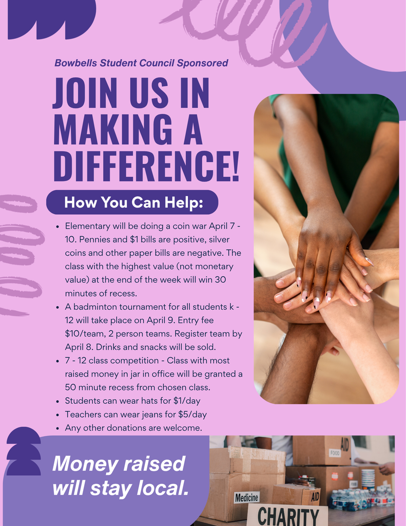 The Student Council service project will take place this week. At the request of one of our potential recipients of the funds, there has been a slight change as to who the money will benefit. The funds will stay local. Thank you for supporting our cause!